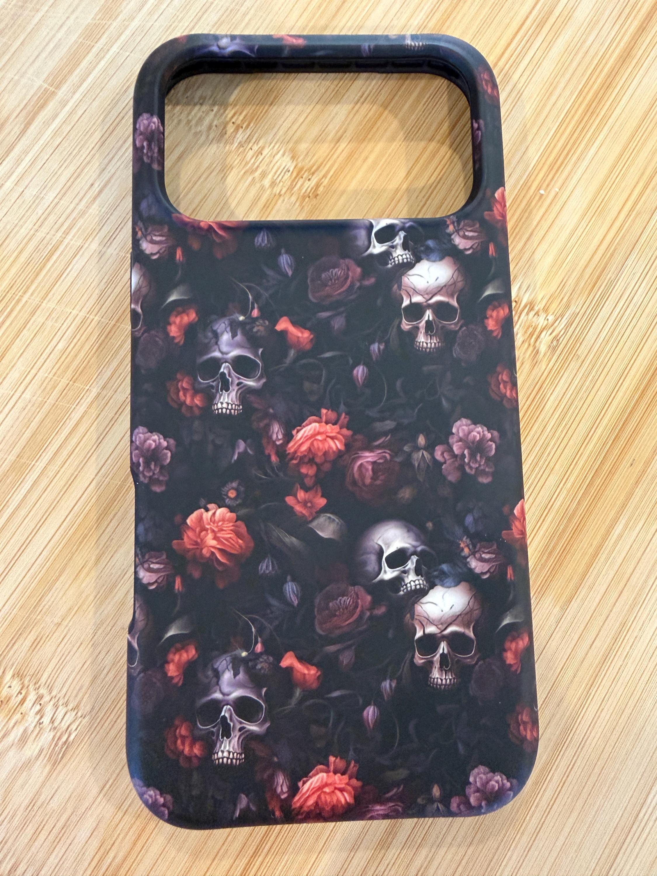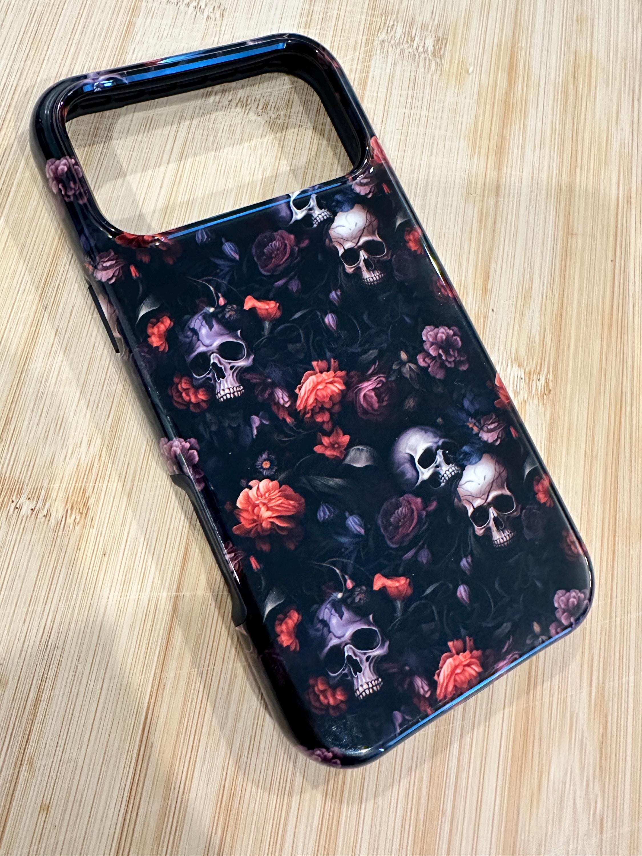 This dual layer tough magnetic iPhone case is designed with a dark goth floral academia aesthetic and is built to provide both style and durability.